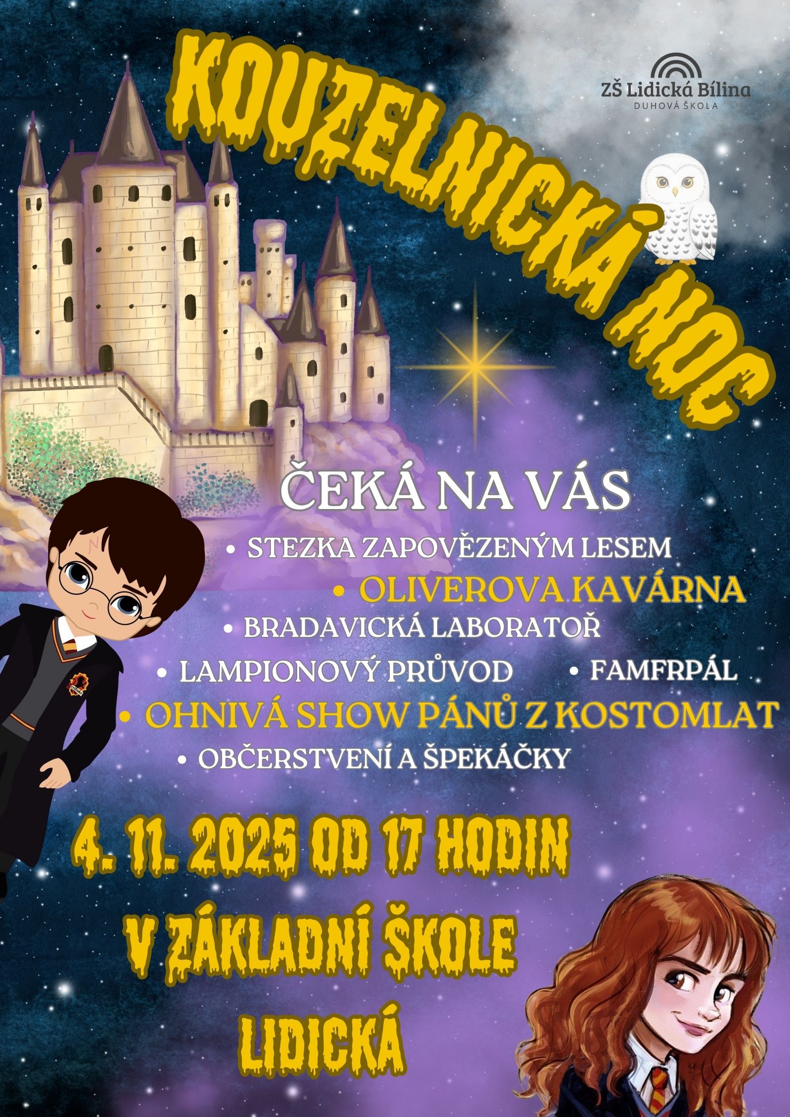 Přijďte si užít magický večer plný kouzel, dobrodružství a podzimní atmosféry. Čeká vás pestrý program inspirovaný světem Harryho Pottera! Přijďte jako student Bradavic, kouzelník, čarodějnice nebo strašidlo!