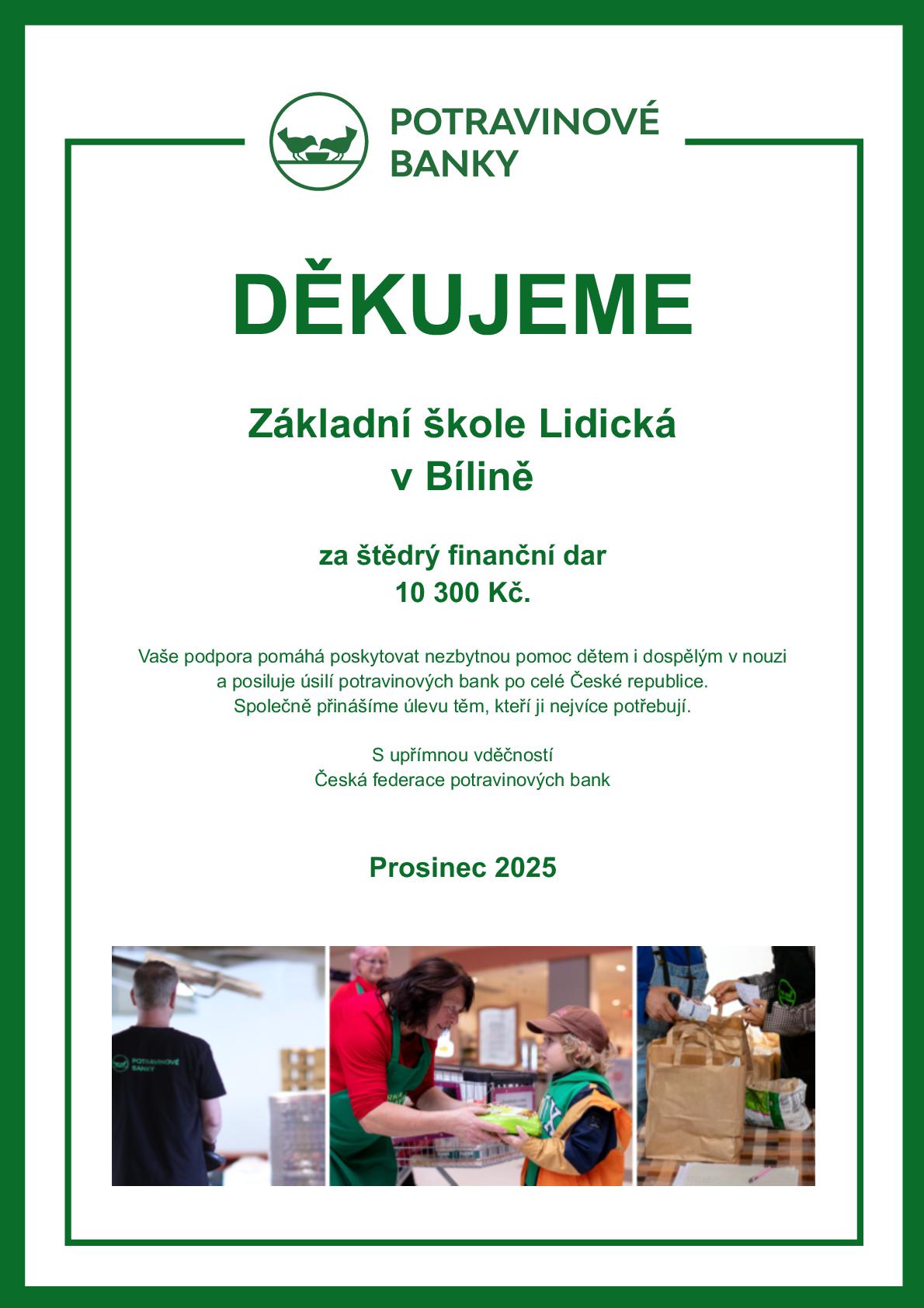 Součástí akce byl také prodej výrobků našich žáků ve stánku, jehož výtěžek jsme věnovali Potravinové bance na pomoc lidem v nouzi. S radostí oznamujeme, že se díky prodeji a příspěvkům dárců podařilo vybrat 10 300 Kč, které byly odeslány na podporu této důležité činnosti.