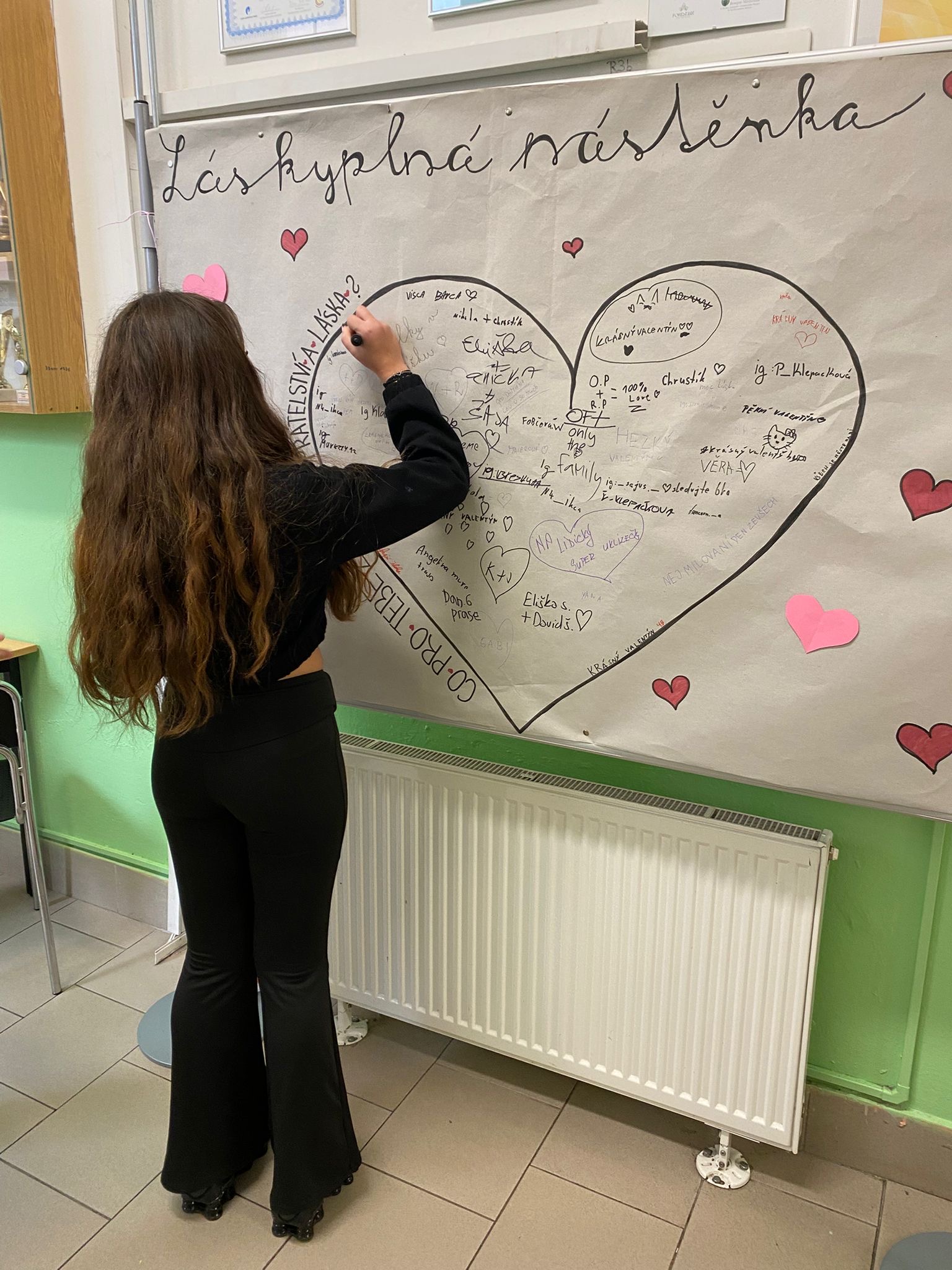 Kromě tradičního fotokoutku byla nově připravena také láskyplná nástěnka, na kterou mohli žáci psát své vzkazy, poděkování či milá slova. Velký zájem vzbudila i valentýnská schránka, do níž mohli žáci vhazovat napsané valentýnky nejen pro své kamarády, ale také pro zaměstnance školy.